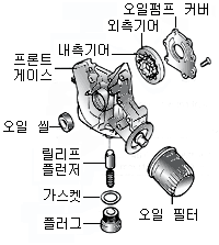 또한 프론트케이스의 측면에는 오일의 압력을 일정한 상태로 조절하는 릴리프 플런저(Relief Plunger)와 오일 필터가 장착될 수 있도록 되어 있다.