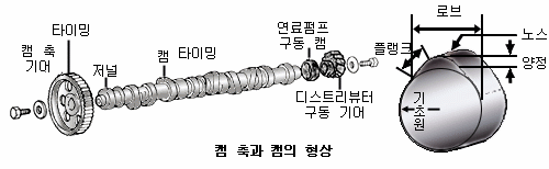 캠 축(cam shaft)은 흡배기 밸브수와 동일한 수의 캠과 캠 축을 실린더 헤드에 지지하는 저널, 연료 펌프를 구동하는 편심 캠 및 배전기 구동용의 헬리컬 기어가 일체형으로 되어 있으며, 일반적으로 내마멸성이 큰 주철을 사용한다. 또한 캠의 양정부위는 칠드층으로 경화시키고 초기 윤활을 위해 표면 화성처리(Parcolubrite)를 한다.