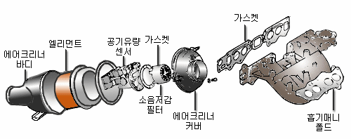 엔진을 작동시키기 위해서 실린더 안에 혼합기를 흡입하기 위한 공기청정기, 인젝트 및 흡기 매니폴드가 있고, 또 혼합기가 연소한 후 그 연소가스를 외부로 배출하기 위한 배기 매니폴드, 배기 파이프, 3원촉매 및 소음기로 구성되어 있다.