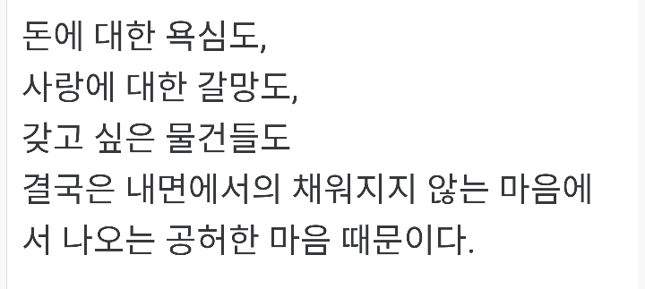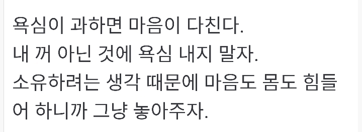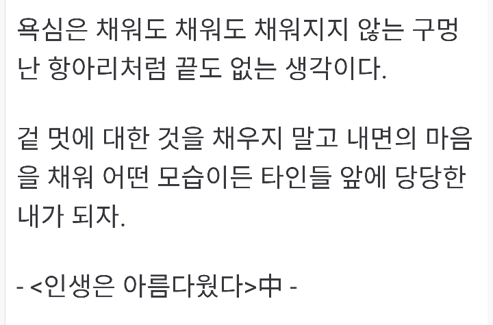 너무 욕심 부리지말자 작성자그대로|작성시간19.11.24|조회수2,756 목록 댓글 1 글자크기 작게가 글자크기 크게가 ♥출처~ 향기있는 좋은글위쳇으로 온 영상 입니다 다음검색 현재 게시글 추가 기능 열기 북마크 공유하기 신고 센터로 신고 댓글 댓글 1 댓글쓰기 답글쓰기 댓글 리스트 작성자김승순좋아유 고마워유 | 작성시간 19.11.25 욕심은 채워도 채워도 채워지지 않는 빵꾸난 항아리 처럼 끝도없는 생각이다 향기나는 따뜬한 마음으로 미소를 한아름 안고 꽃길을 걸어 간다면 타인들 앞에 당당한 내가 될까요 좋은글 영상 감사 합니다 이미지 확대 댓글 전체보기