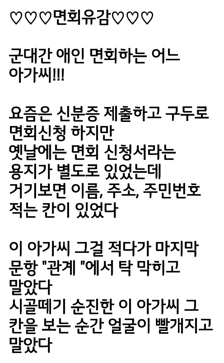 면회유감 작성자그대로|작성시간19.08.22|조회수598,033 목록 댓글 4 글자크기 작게가 글자크기 크게가 ♥카톡으로온 유머 옮겨왔습니다 다음검색 현재 게시글 추가 기능 열기 북마크 공유하기 신고 센터로 신고 댓글 댓글 4 댓글쓰기 답글쓰기 댓글 리스트 작성자후광리 | 작성시간 19.08.27 재밌네 ㅋㅋㅋ 답댓글 작성자그대로 작성자 본인 여부 작성자 | 작성시간 19.09.03 감사합니다다녀가셨네요즐거운 시간되시기 바랍니다행복한 시간 여유로운 시간 되시기 바랍니다 작성자김승원 | 작성시간 21.03.27 ㅋㅋㅋㅋㅋㅋㅋㅋㅋㅋㅋㅋㅋㅋㅋㅋㅋㅋㅋㅋㅋㅋㅋㅋㅋㅋㅋㅋㅋㅋㅋㅋㅋㅋㅋㅋㅋㅋㅋㅋㅋㅋㅋㅋㅋㅋㅋㅋㅋㅋㅋ 맞네ㅔㅔ 작성자김승원 | 작성시간 21.03.27 이미지 확대 댓글 전체보기