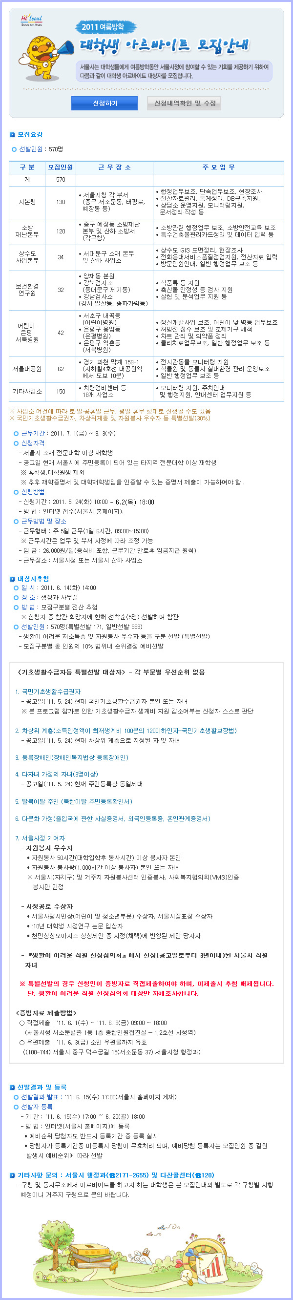 [서울시청 행정과] 2011년 여름방학 대학생 아르바이트 모집안내 작성자나영균|작성시간11.05.25|조회수77 목록 댓글 0 글자크기 작게가 글자크기 크게가 2011년 여름방학 대학생 아르바이트 모집안내 신청하기 참고 http://spp.seoul.go.kr/main/news/news_info.jsp?searchType=ALL&searchWord=&list_start_date=&list_end_date=&pageSize=10&branch_id=&branch_child_id=&pageNum=1&communityKey=B0159&boardId=3486&act=VIEW 다음검색 현재 게시글 추가 기능 열기 북마크 공유하기 신고 센터로 신고 댓글 댓글 0 댓글쓰기 답글쓰기 댓글 리스트