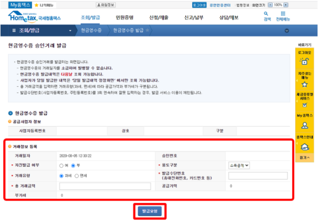 승인 문자를 받은 후에는 현금영수증 ‘승인거래 발급’을 선택하여 필요한 정보를 입력하고 발급요청을 누르면 됩니다.