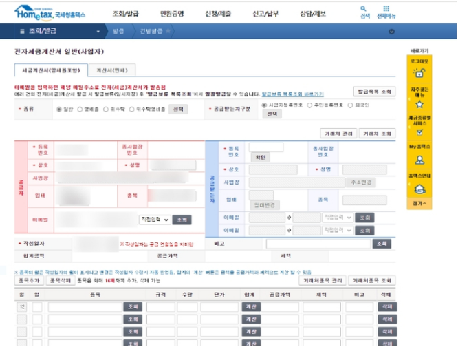 그 후에는 종이 세금계산서에 기입하는 것과 크게 다르지 않기 때문에 순서대로 작성을 해주면 되는데요.