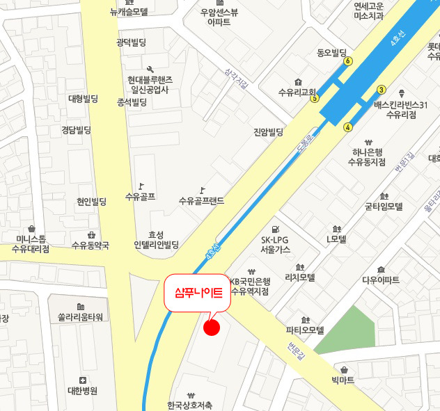 수유역 4번 출구를 나와서 걸어서 한 100m정도에 위치한 9층 정도의 건물에 위치하고 있다.