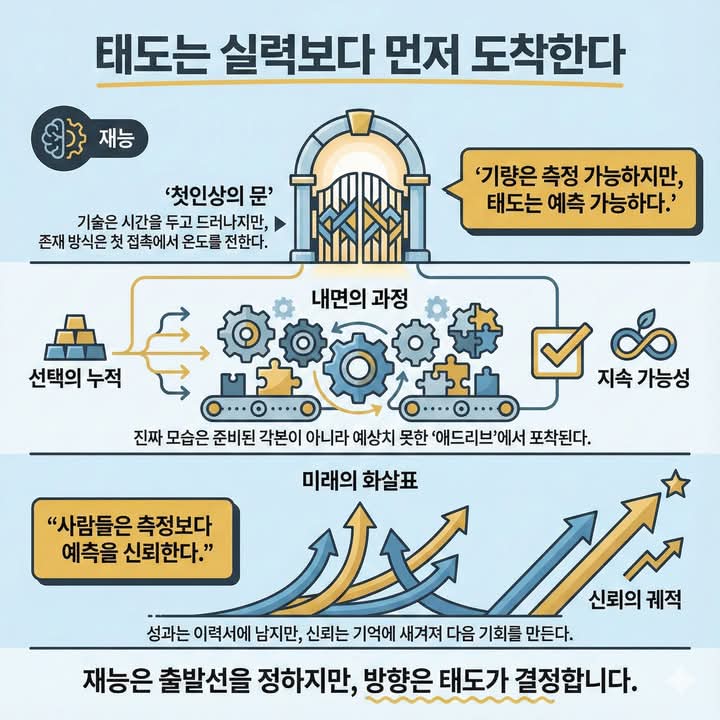 결국 우리가 보는 것은 현재의 수준이 아니라 미래의 궤적이다. 재능은 출발선을 정하지만, 방향은 태도가 결정한다. 뛰어난 잠재력을 가지고도 중간에 소멸하는 경우를 우리는 셀 수 없이 목격한다. 동시에 처음엔 평범해 보였던 사람이 몇 년 뒤 예상치 못한 높이에 서 있는 광경도 본다. 그 분기점을 만드는 것은 대개 태도이다. 기량은 측정 가능하지만, 태도는 예측 가능하다. 그리고 사람들은 측정보다 예측을 신뢰한다.