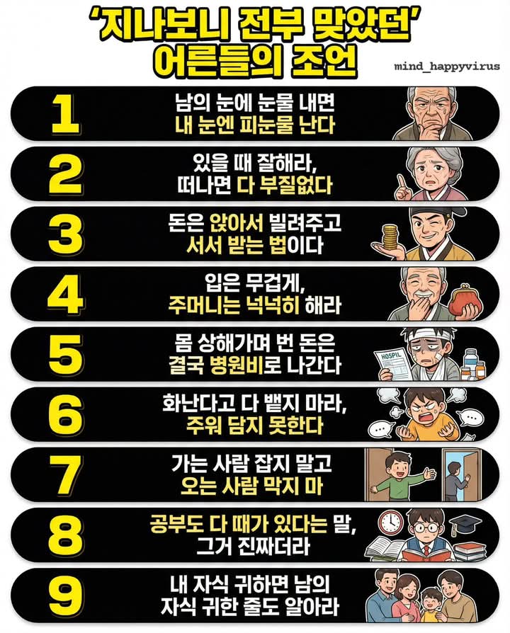 지나보니 모두 맞았던 어른들조언 작성자쉐도우영.|작성시간26.04.09|조회수86 목록 댓글 2 글자크기 작게가 글자크기 크게가 😅 어른들 말씀 틀린 거 하나 없다는 게 진짜 인생의 진리인 것 같아요.#글스타그램 #공감글 다음검색 현재 게시글 추가 기능 열기 북마크 공유하기 신고 센터로 신고 댓글 댓글 2 댓글쓰기 답글쓰기 댓글 리스트 작성자쉐도우영. 작성자 본인 여부 작성자 | 작성시간 26.04.09 이미지 확대 답댓글 작성자쉐도우영. 작성자 본인 여부 작성자 | 작성시간 26.04.09 이미지 확대 댓글 전체보기