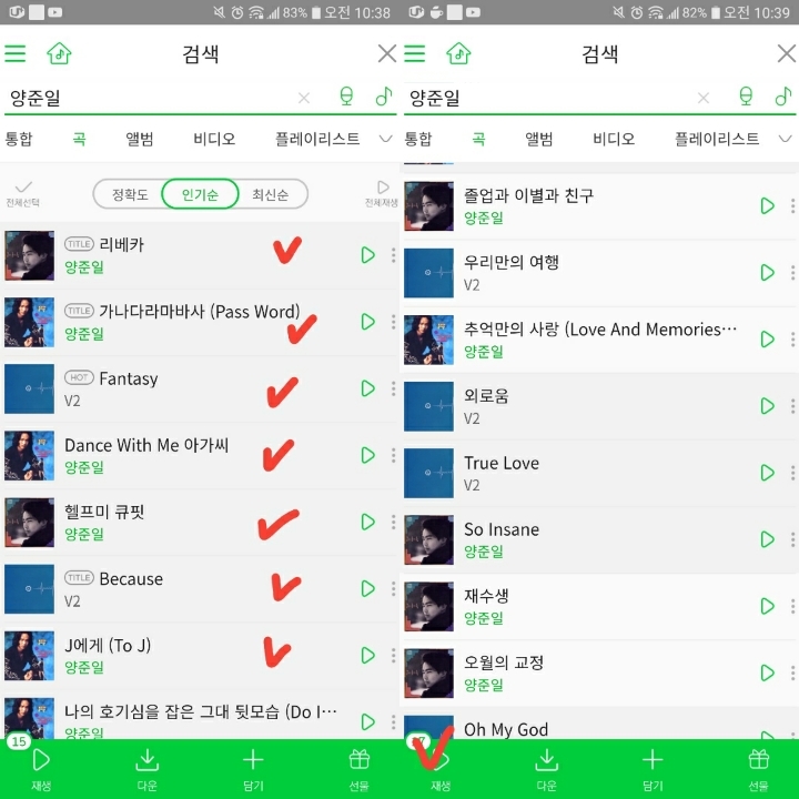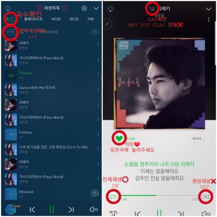 8.곡에 음악들 담긴거 확인하시구요. 플레이버튼 눌러주세요. 들어가셔서 ♥ 랑 전체반복재생 버튼 눌러주시면 됩니다.
