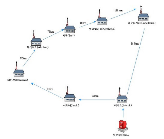 ⑫. 에베소(Ephesus) 동쪽 수리아(Suria)로 가는 길에 있고, 아시아에서 가장 중요한 길목 중 하나. 그 길은 에베소 해안에서 시작해 약 2,800미터 높이의 중앙 고원을 올라가는 길인데, 깎아지른 듯한 메안델강의 협곡을 피해 완만한 리쿠스(Lycus) 계곡을 거쳐야 아시아로 갈 수 있는 유일한 길이다.