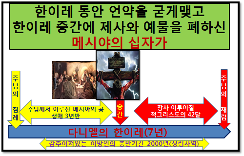 『단9: 27......그가 그 이레의 절반에 제사와 예물을 금지할 것이며』...이같이 성전에서 드려지던 동물제사의 율법을 대신하여 자신의 몸을 드리시고 완전한 한번의 제사로 대체하신 것이다. 이후로는 더 이상 성전제사의 효능이 사라지고 오순절 이후로 믿음의 제사를 열납하시는 시대가 열린 것이다.