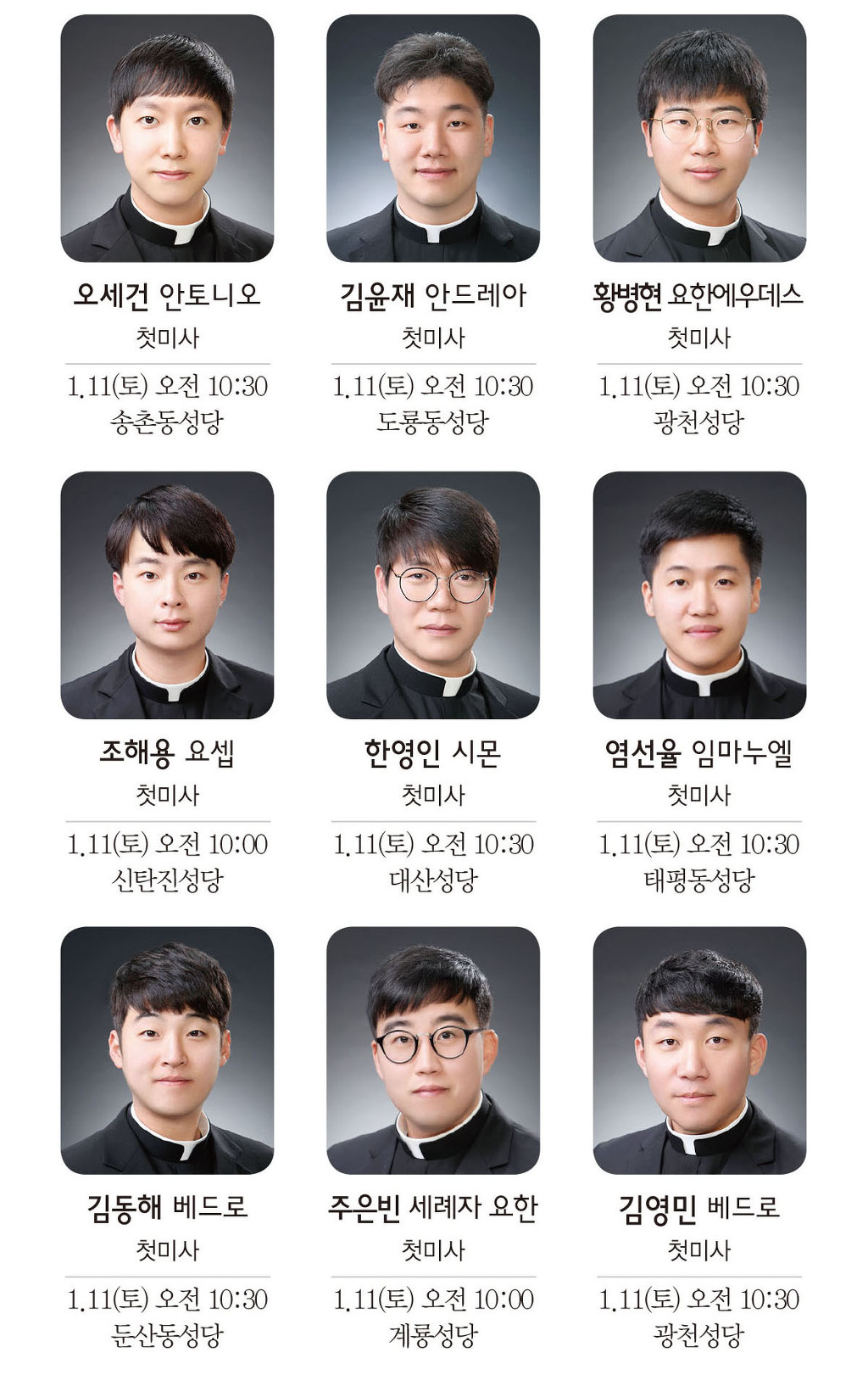 이번에 사제서품을 받은 부제는 오세건 안토니오(송촌동), 김윤재 안드레아(도룡동), 황병현 요한에우데스(광천), 조해용 요셉(신탄진), 한영인 시몬(대산), 염선율 임마누엘(태평동), 김동해 베드로(둔산동), 주은빈 세례자요한(계룡), 김영민 베드로(광천)이다. 이들 9명은 11일(토) 각자 출신 본당에서 첫 미사를 집전하고 교구 사제인사에 따라 임지로 부임하게 된다.
