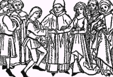 1390년 드뢰에서 벌어진 결혼축하연에서는 초대된 손님들이 결혼 청첩비를 요구하며 소란을 피운 기록이 남아있다. 탄원자는 그들이 연회에 초대받고도 노래를 부르지 않았기 때문에 돈을 줄 수 없다고 거절하였고, 이것이 분쟁을 일으킨 것이다. 이것은 결혼식 피로연에서 결혼 청첩비를 타내기 위해 꽤 많은 젊은이들이 모였고, 그들에게 신랑 측은 술과 음식을 제공하거나 혹은 돈으로 회사하여 그들을 달랬었다.