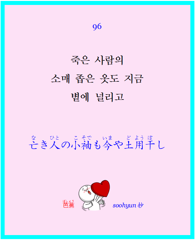 HAIKU 96 작성자베사메무쵸 Besame Mucho|작성시간20.06.18|조회수24 목록 댓글 2 글자크기 작게가 글자크기 크게가 다음검색 현재 게시글 추가 기능 열기 북마크 공유하기 신고 센터로 신고 댓글 댓글 2 댓글쓰기 답글쓰기 댓글 리스트 작성자이케바나 | 작성시간 20.06.18 何の為死んだ人の着物を干してるんですか。きになるんですね。 답댓글 작성자베사메무쵸 Besame Mucho 작성자 본인 여부 작성자 | 작성시간 20.06.18 곰팡이. 벌레등의 피해를 막기위해 옷과 책을 햇볕에 내다 너는 연중행사인듯... 댓글 전체보기