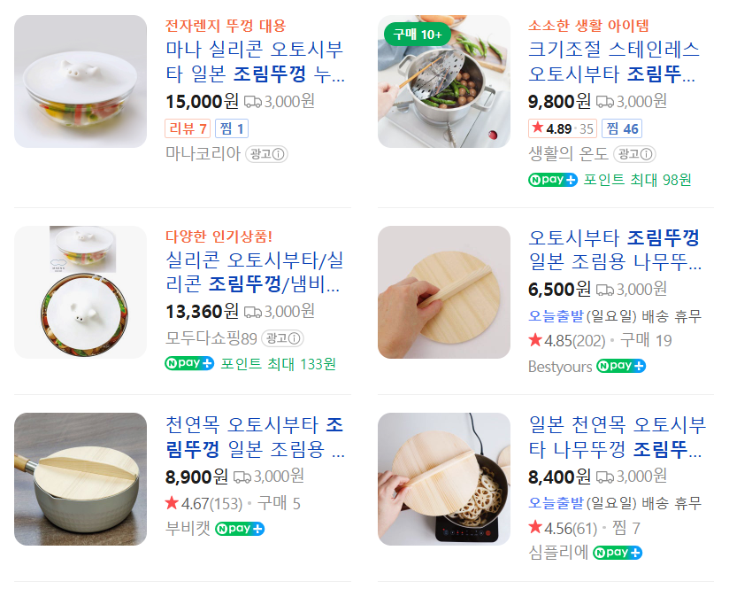 落し蓋(おとしぶた)를 ‘조림 뚜껑’이라고 부르고, 한국에서도 수입해서 파네요.