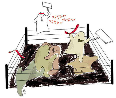 무오년, 서옥에서 바라보다(73Χ50cm): 역사를 기록하는 사관들은 항상 권력과 긴장 관계에 있었다. 훈구파와 사림 간의 긴장은 연산군 시절 무오사화를 계기로 폭발했다. 필화(筆禍)사건이 터지면 대(代)를 이은 숙청과 보복의 역사를 낳아 수많은 선비를 죽음으로 내몰았다. 우승우(한국화가) |