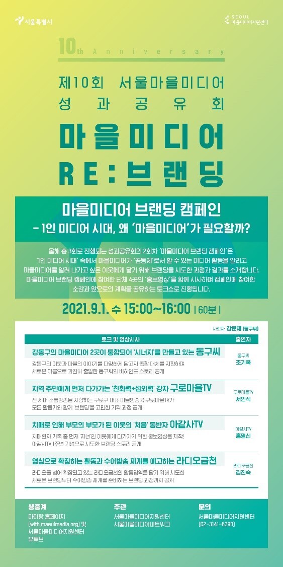 토크쇼는 구글 설문지를 통해 사전 신청이 가능하며, 마을미디어 플랫폼 ‘마미랑’과 서울마을미디어지원센터 유튜브를 통해 시청이 가능합니다.