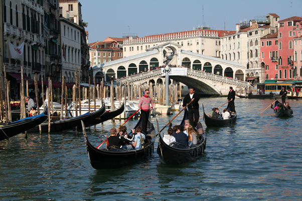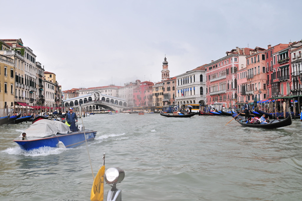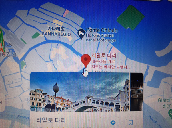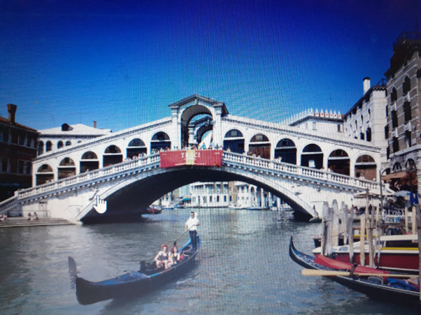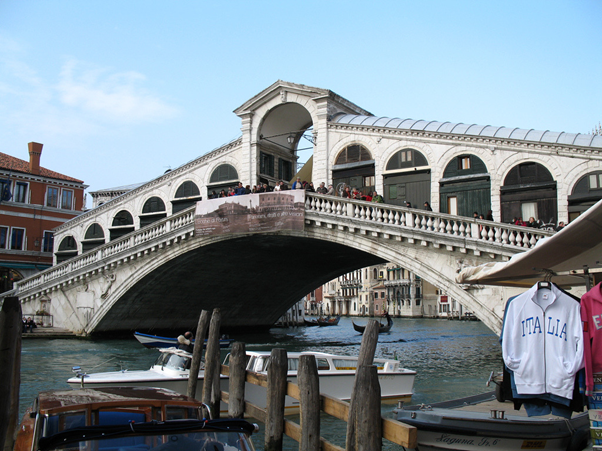 베네치아 리알토 다리 (Ponte di Rialto)가 보인다 리알토 다리(Rialto Bridge) "베네치아에서는 리알토 다리(Rialto Bridge)를 보아라."라는 말이 있을 정도로 유명한 다리이다. 예전부터 리알토 다리 주변은 상권의 중심가였다.12세기경, 넘쳐나는 상품들과 사람들의 수요를 배가 감당하지 못하자 이 다리가 건설되었다.그러나 16세기 까지는 나무 다리를 임시로 사용하다가, 16세기 말 돌로 된 이 다리를 만들었다. 대리석으로 만들어진 이 다리는 1854년 아카데미아 다리가 지어지기 전까지 대 운하를 건너는 유일한 다리였다