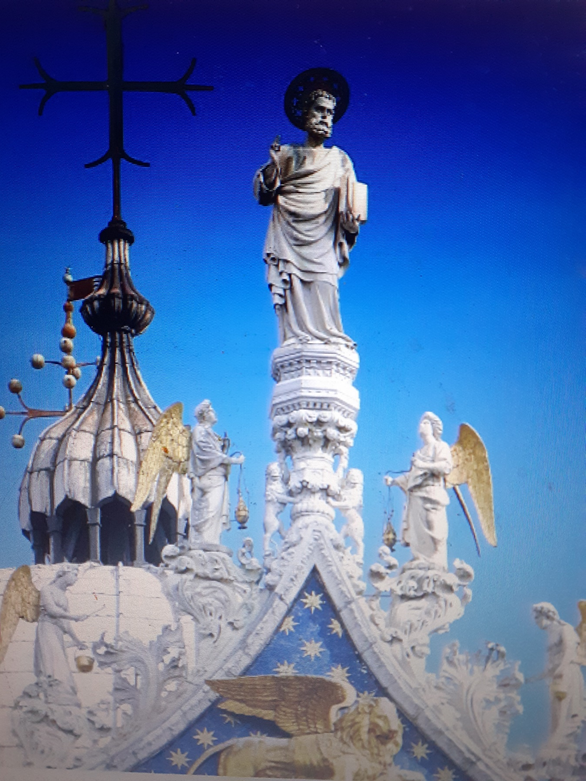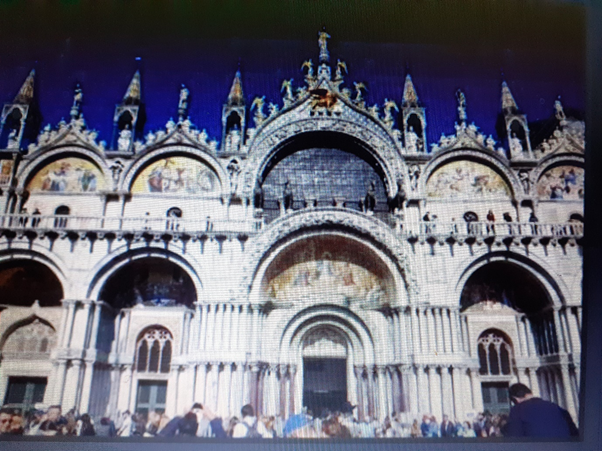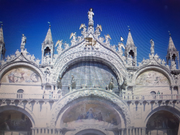 맨 위에 조각 된 분이 베네치아의 수호 성인인 산 마르코의 조각상이고 그 주변 인물들은 그를 옹호하는 전사들의 모습이며 산마르코 밑에 사자는 수호 성인인 마가를 상징하는 동물이며 그 밑에 청동 말 4필은 십자군 전쟁 때 콘스탄티노풀에서 가져온 전리품으로 한때 나펠레옹 한테 빼앗겼으나 19세기에 반환 받아 이성당 박물관에 보관 하고 있다 맨 밑 하단벽화는 1836년모자이크를 추가한 것으로 성서에 나오는 마지막 심판을 표현한 것이라 한다