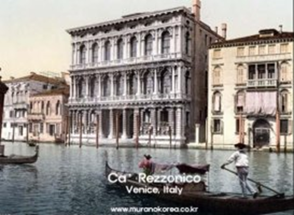 여기는 18세기 베네치아의 모습을 보여주는 카 <레조니코 박물관>의 전경으로 이 카 레조니코 (Cà Rezzonico)는 17세기 본가문에서 베니치아의 건축가 발다 사례 론게나에게 부탁하여 건축 시작하였으나 자금 부족으로 완성하지 못한 것을 18세기 제노바 레초니코 가문에서 사들여 조르조 미시리로 하여 완성하게 한 궁전으로 현재는 18세기의 베니치아박물관으로 그 당시 베네치아의 모습을 잘 볼 수 있는 곳이다. 이 건물의 핵심은 조르조마사리 무도장으로 황금빛 샹들리에가 몹시 아름답다고 한다. 티에폴로의 천장화들과 피에트로 론기, 카날레도 등의 회화작품들과 그 시대의 의복이 전시돼 있다 한다.