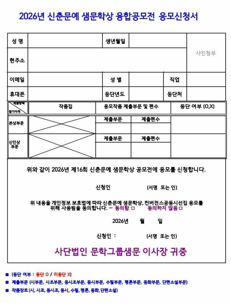 [샘문뉴스]= 2026 제16회 신춘문예 샘문학상 공모전 시행요강 공고 - 서울특별시, 중랑구 등 후원 https://m.cafe.daum.net/ssm9539/Sdp0/6423?svc=cafeapp