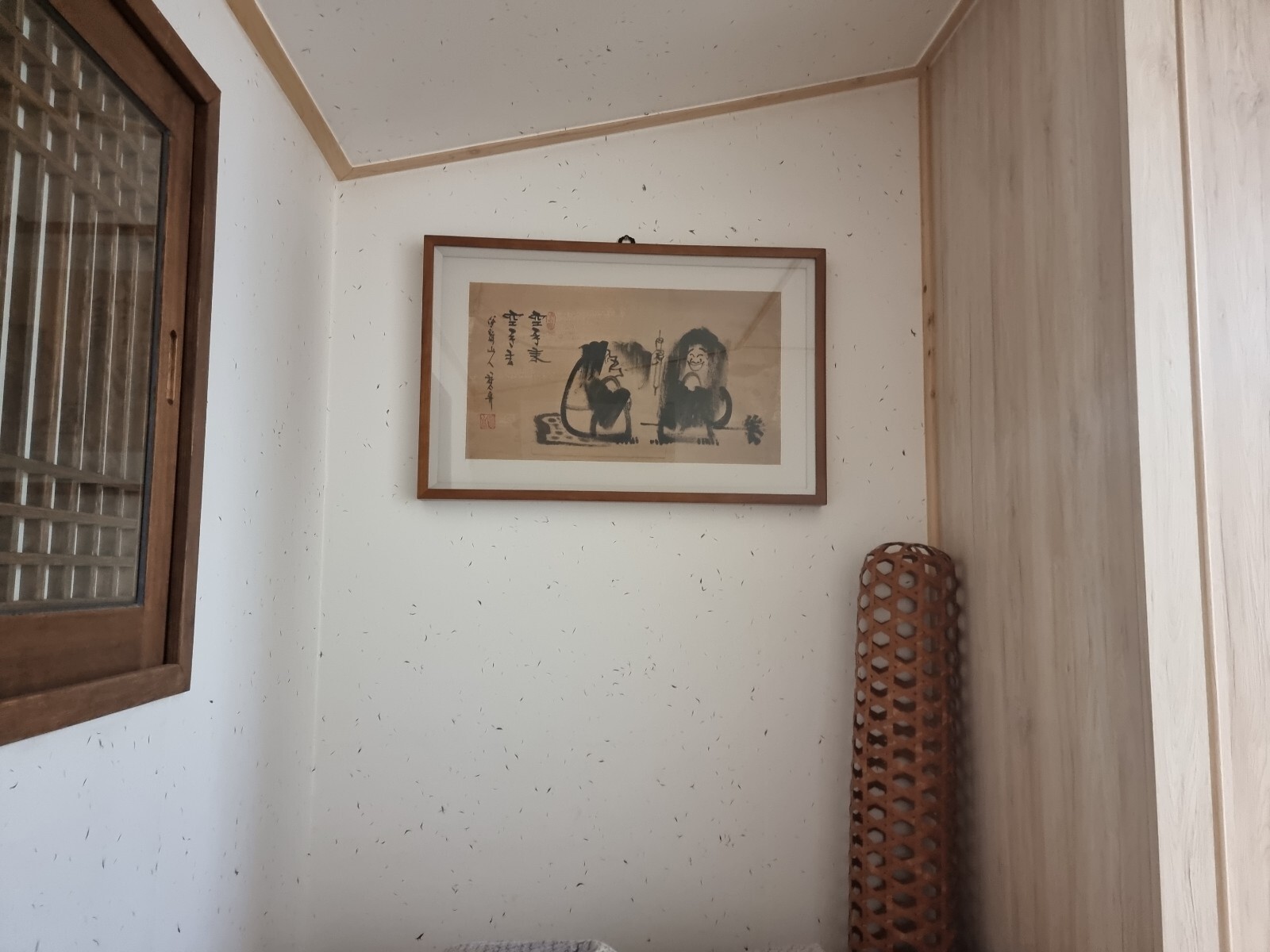 아무튼, 이 새벽에 불쑥 든 생각이 내가 태어난 바로 이 자리에서 내가 숨을 거둘 수 있을까? 하는 것이었다. 복이라면 최고의 복일 것같다. 아니, 꼭 그렇게 안된다한들, 자기가 태어난 자리에서 이제 날마다 몸을 눕히는 사람이 과연 몇 명이나 있을까? 그런 점에서라도 나는 참 대단히 행복한 넘이 아닌가. 소원대로 그리 된다면, 태어난 자리에서 눈을 영영 감는 게 나라면 행운아중의 행운아. 어쩌면 기네스북에도 오르지 않을까. 흐흐. 이제 이 시대는, 잘 사는 것(웰빙. WELL BEING)만큼 잘 죽는 것(웰 다이잉. WELL DYING)이 못지 않게 중요하게 되지 않았는가. 머리맡 반대편 벽에는 오랜 친구가 선물한 ‘달마도의 대가’ 범주梵舟(2018년 해탈. 세수 77세) 스님이 그린 ‘한산습득도’(寒山拾得: 당나라때의 유명한 두 스님)가 걸려 있다. 화제畫題가 ‘공수래공수거空手來空手去’이어서 더욱 인상적이다. 그렇다. 바로 이 자리에서 ‘빈 손’으로 왔는데, 몇 년 후가 될지 모르지만, 바로 이 자리에서 ‘빈 손’으로 가는 인생을 꿈꾸어본다. 바로 그럴려고 귀향을 하여 생가生家를 찾지 않았던가. 희망사항이 실천사항이 되기를 간절히 꿈꾸어본다. 흐흐.