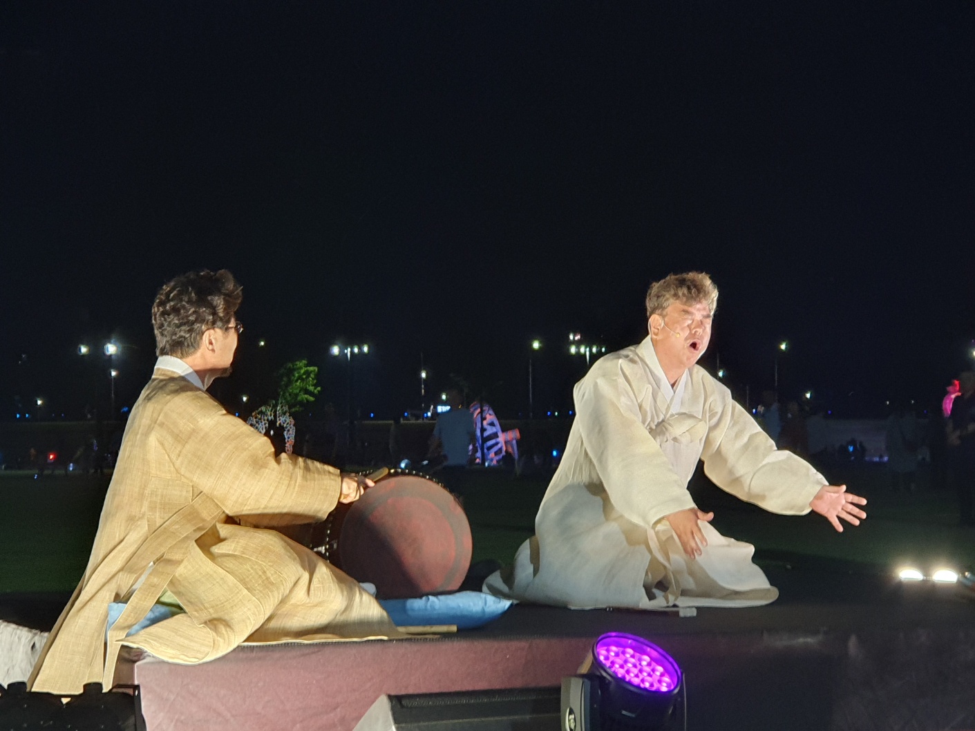 그런데 포스터에 박힌 사진과 제목이 눈길을 사로잡았다. <배일동 명창 K-클래식/6.17. 순천 오천그린광장>, 으잉? 배일동? 맞아. 순천 출신이었지. 한양에 있을 때 몇 번 만나 짧은 소리도 듣고 술도 기울인 적이 있었지. 아무리 바빠도 만나러, 들으러 가야겠다. 순천에 사는 외우畏友와 모처럼 만나는 것도 좋은 일이고. 하여, 어제 밤7시, 몇 년만에 반갑게 만나 서로 보듬고 즐거워했다. 소리꾼답게 그 넓은 오천그린광장의 공중空中을 휘어잡았다. 단가인 <사철가>로 목을 다듬더니, 월매와 이몽룡이 만난 장면과 심봉사와 심청이 만난 장면을 절절하게 토해낸다. 아예, 운다. 울어. 듣고 있어도 믿기지 않는 저 ‘폭포 목청’에 잔디밭에 아무렇게나 앉아 듣고 있던 1000여명의 청중 박수가 쏟아진다. 아아-, 저런 목청과 재주는 어디에서 나온 것일까?