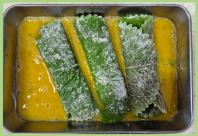앞뒤로 부침가루를 살짝 뿌린 깻잎 위에~