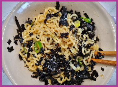 꼬들꼬들한 라면에 들기름과 간 깨, 김가루가 들어가서