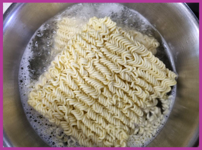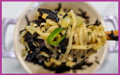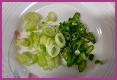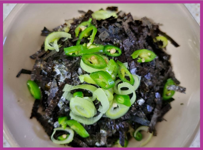 재료(2인분):라면 2봉지, 김가루 14g, 스프 1개, 대파 13g, 청양고추 2개