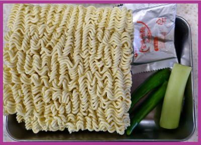 라면 두 개와 스프 한 개, 대파, 청양고추,