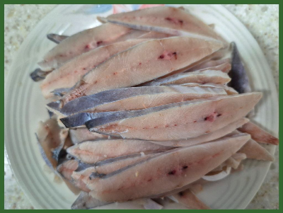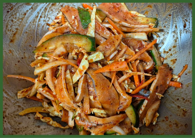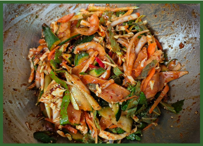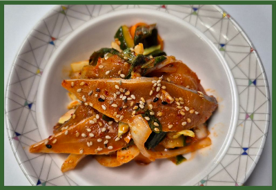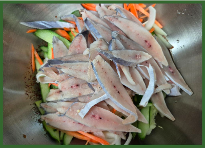 재료:병어 2마리, 오이 1/2개, 양배추 110g, 양파 1/2개, 당근 36g