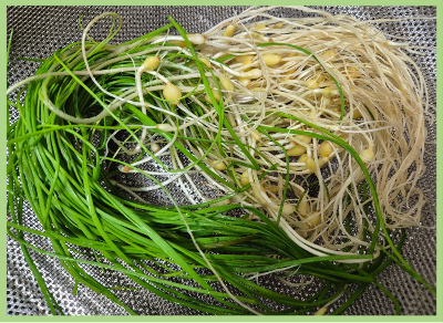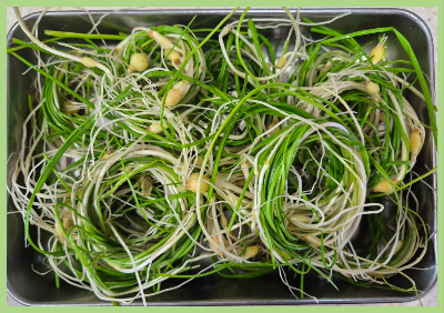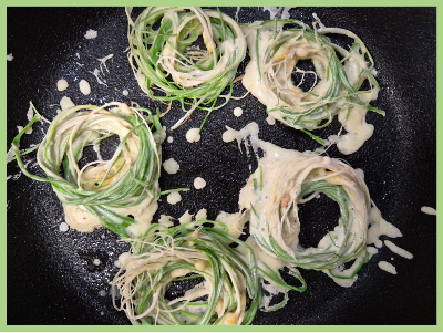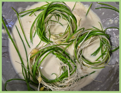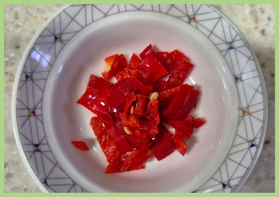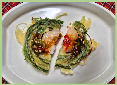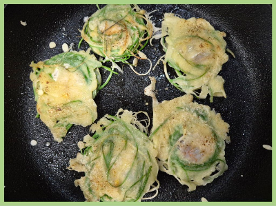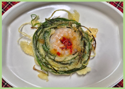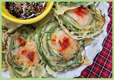 재료:달래 90g, 새우살 10개, 홍고추 1개, 부침가루 1/3컵, 튀김가루 1/3컵