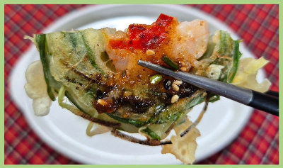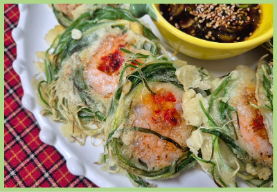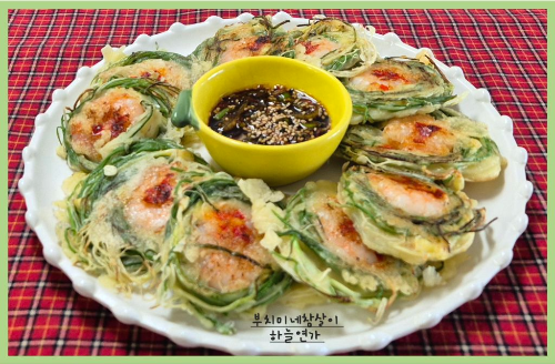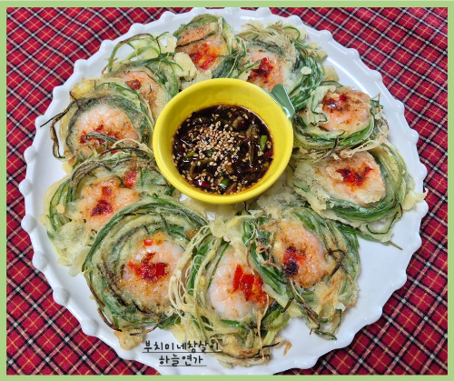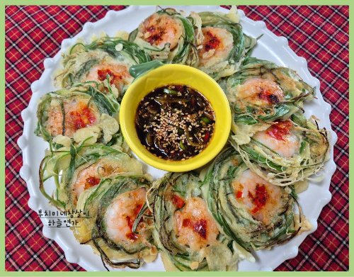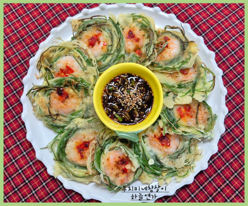 그릇에 담고 양념장을 곁들여 내면 맛있는 새우 달래전이 완성입니다.