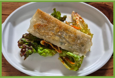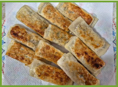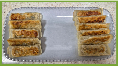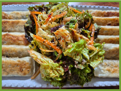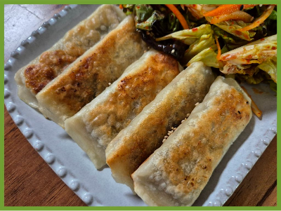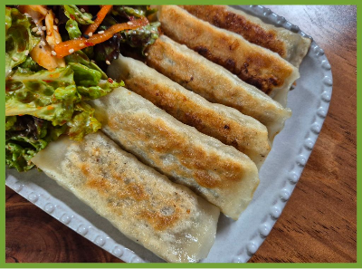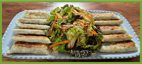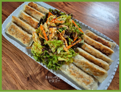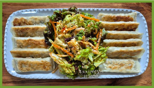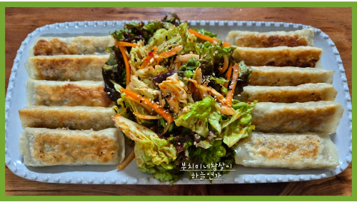 바삭하게 구운 만두를 신선한 상추 무침과 함께 맛있게 먹었어요.