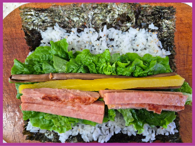 스팸, 단무지, 우엉을 올려서~