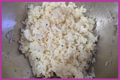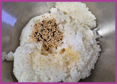 즉석밥에 소금 약간과 통깨, 참기름을 담아~