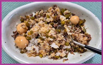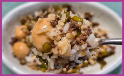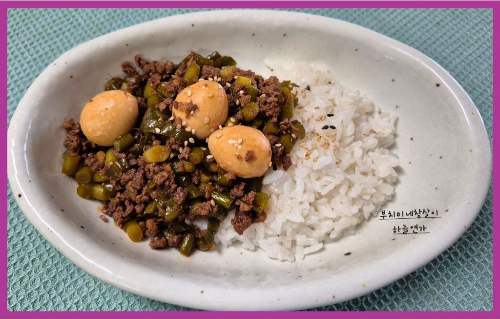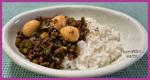 밥 위에 적당히 담아 내면 맛있는 장조림 비빔밥이 완성입니다.