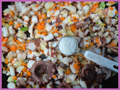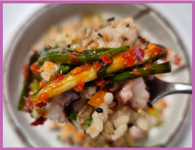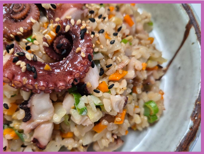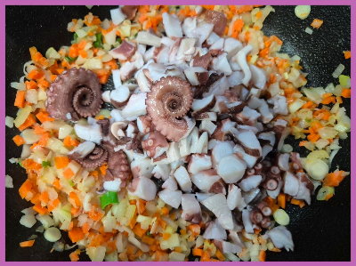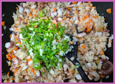 재료(3인분):밥 크게 1공기, 삶은 문어 294g, 쪽파와 대파 70g, 양파 1/2개