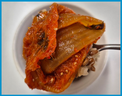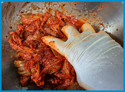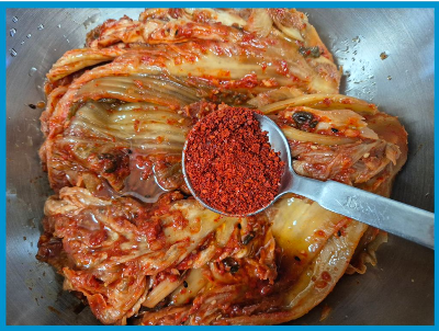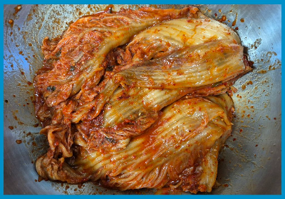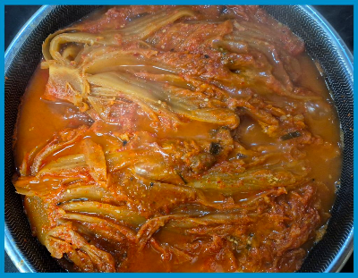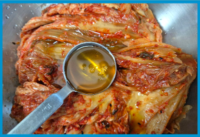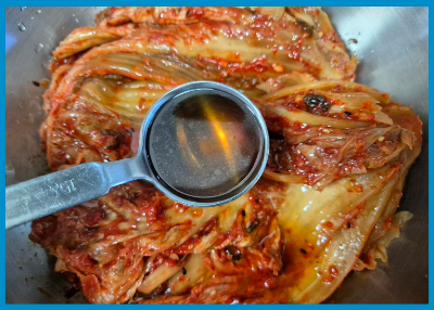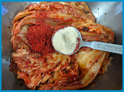 재료:묵은지 2쪽(1099g), 들기름 3T, 매실액 1.5T, 참치액 2T, 고춧가루 1T