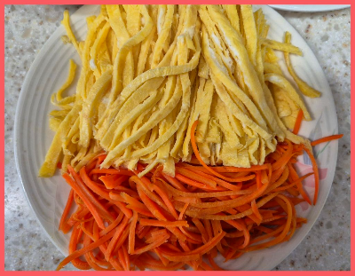 재료:당근 72g+소금 세 꼬집, 달걀 3개+소금 1/4t+참기름 1t, 새우살 8개