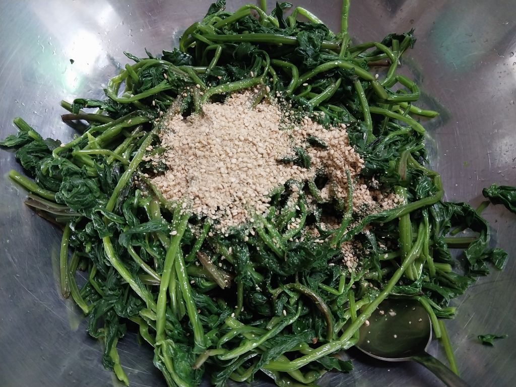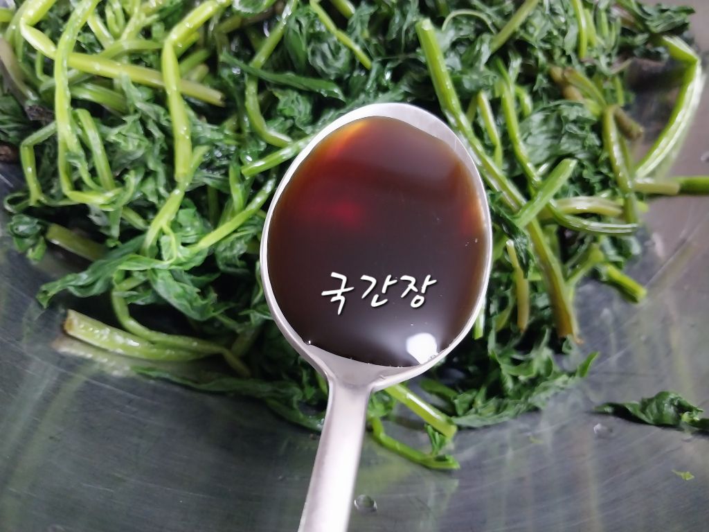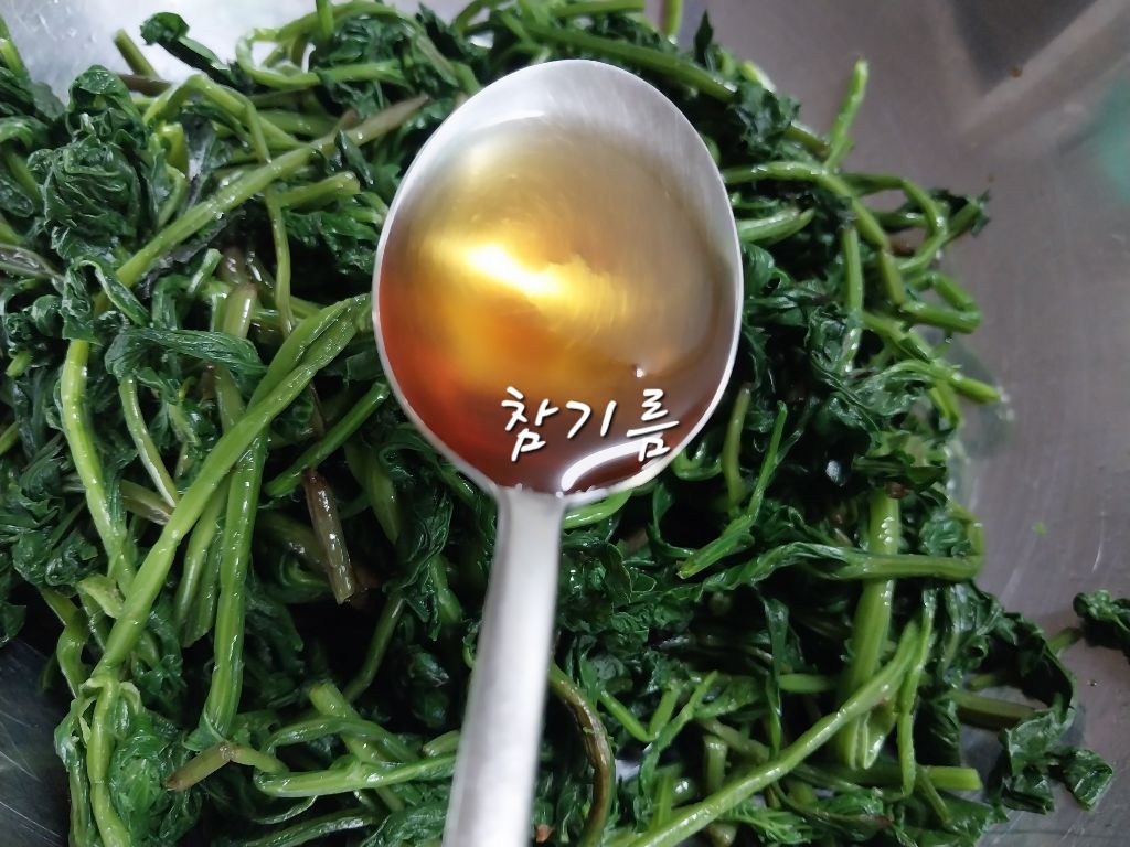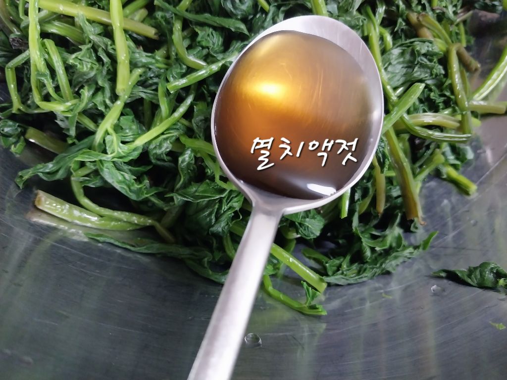 재료- 데친삼잎나물624g,멸치액젓2큰술,국간장4큰술,참기름2큰술,깨소금2큰술