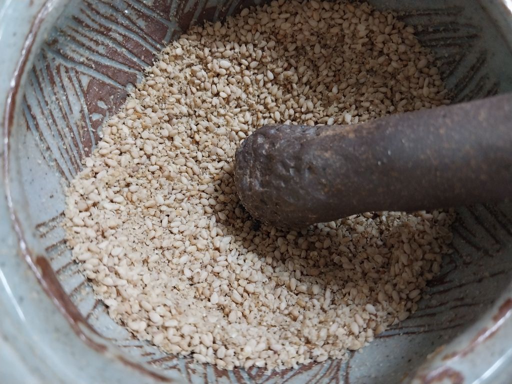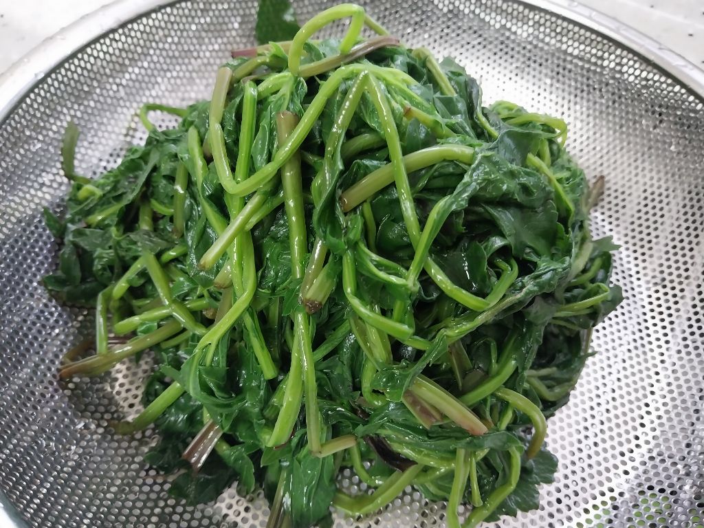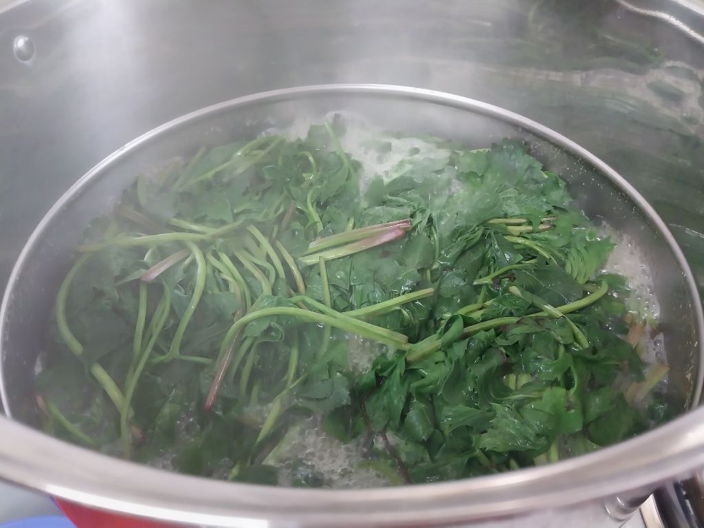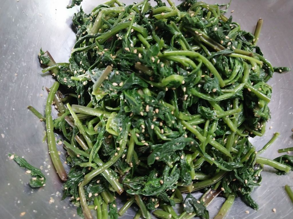 재료- 데친삼잎나물624g,멸치액젓2큰술,국간장4큰술,참기름2큰술,깨소금2큰술
