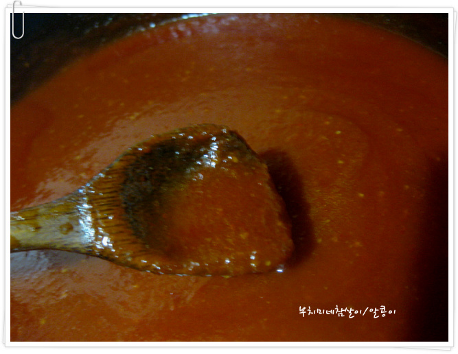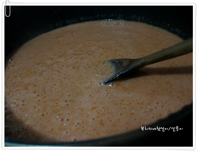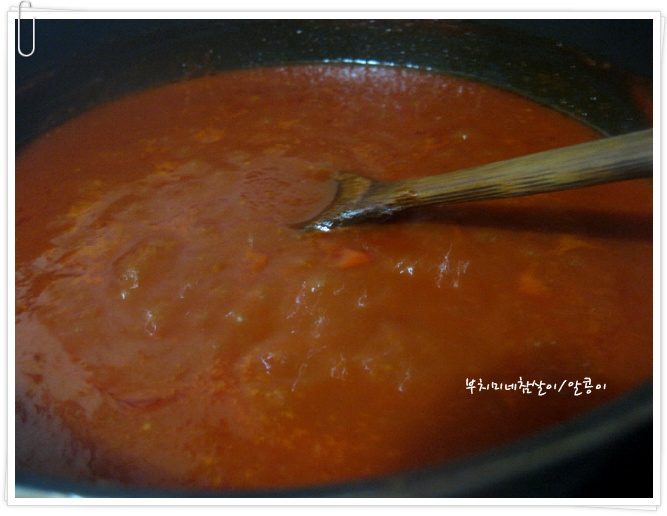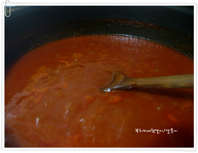 두꺼운 팬에 갈아진 토마토 쏟아 붓고 설탕,소금 투하해서 끓입니다.