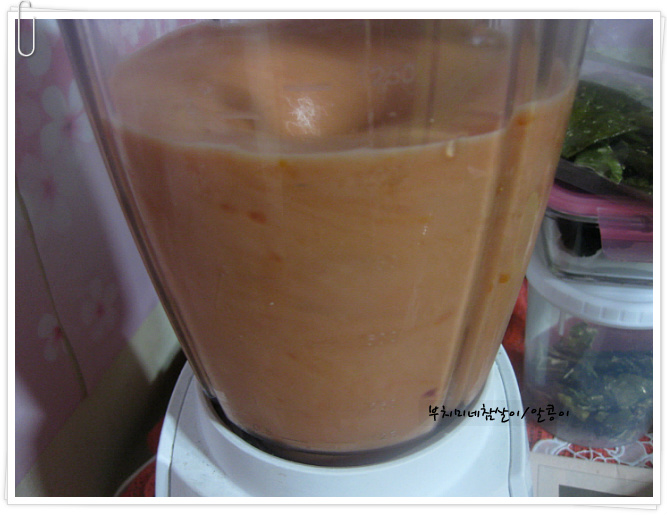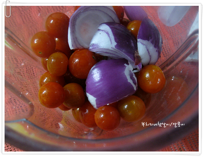 방울토마토 씻어서 꼭지 따주시고 물기 제거한후 양파 반쪽 넣어 믹서기에 휙~
