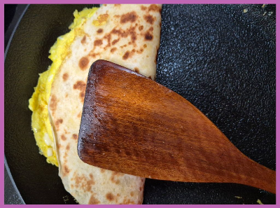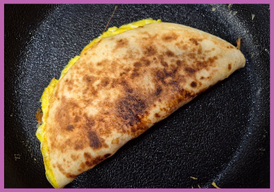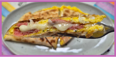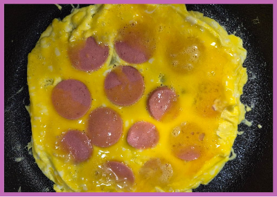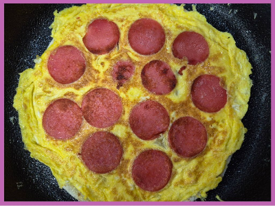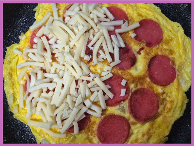 재료:또띠아 1장, 달걀 2개, 피자치즈 50g, 옛날 소시지 56g, 소금 1/4t