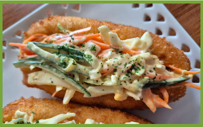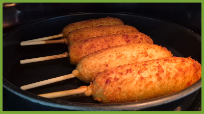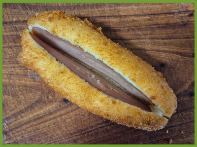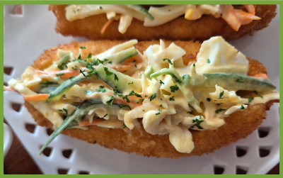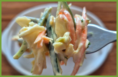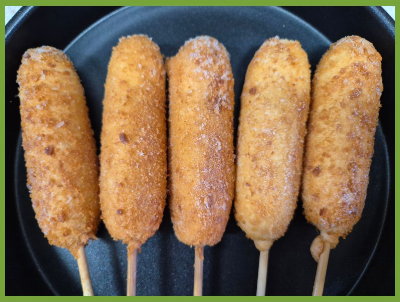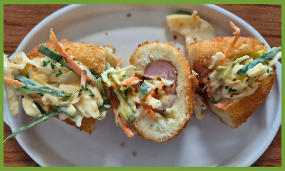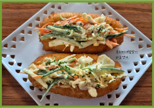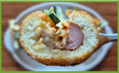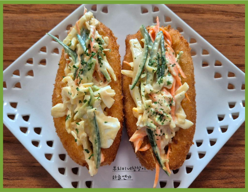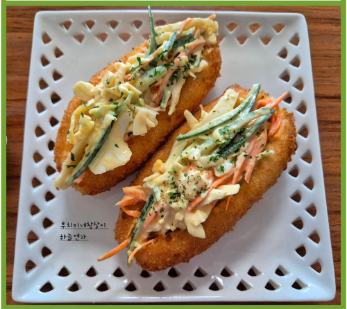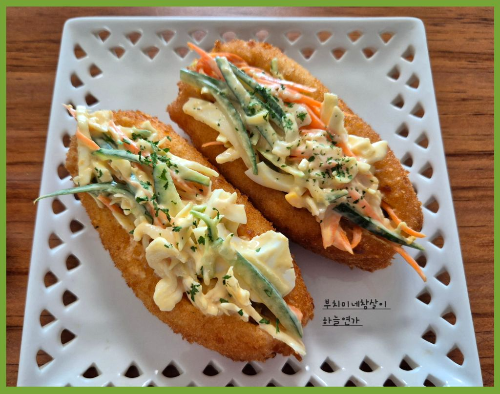 고소한 맛이 좋은 야채 사라다를 만들어 시판용 냉동 핫도그에 담아 먹은