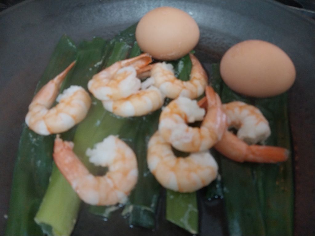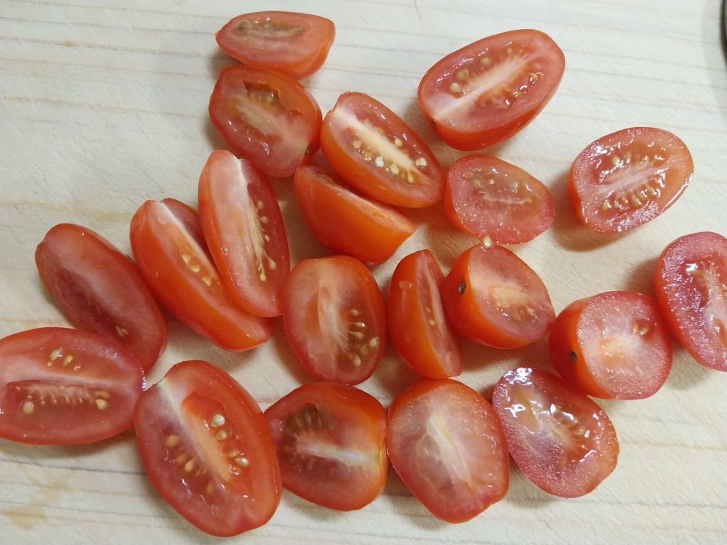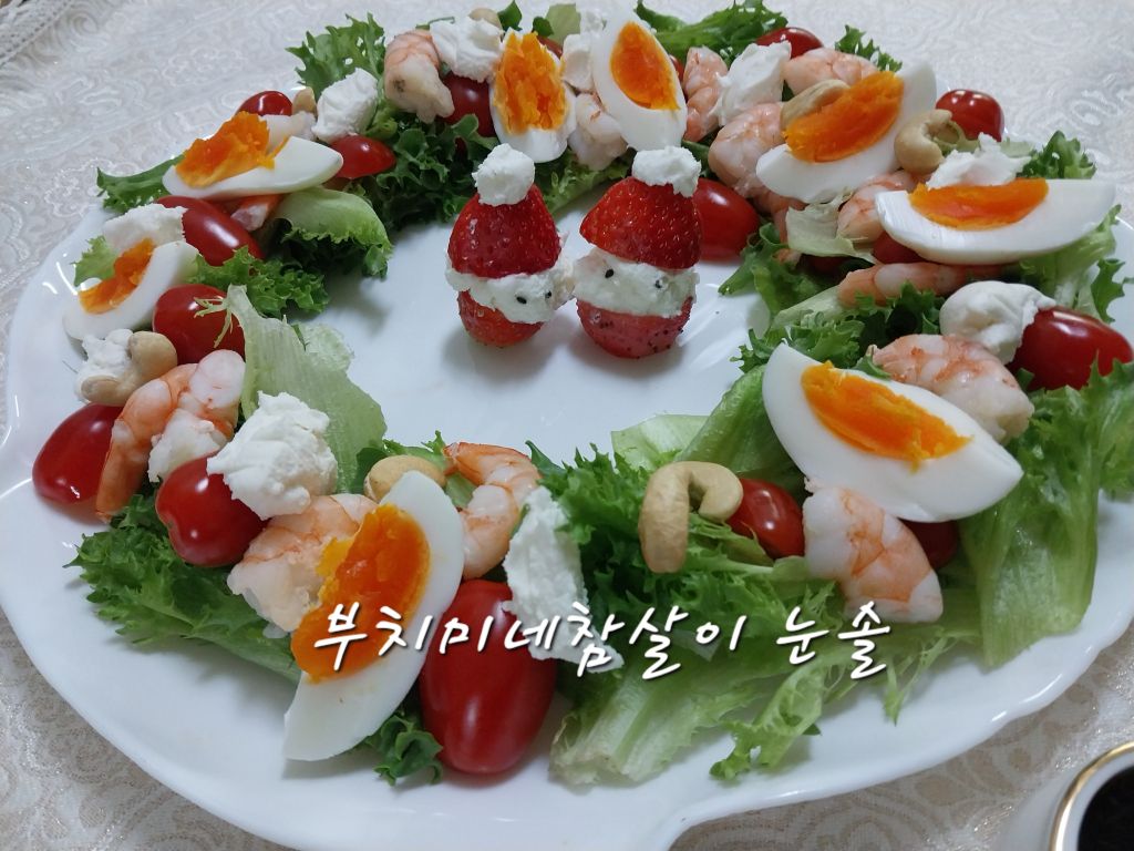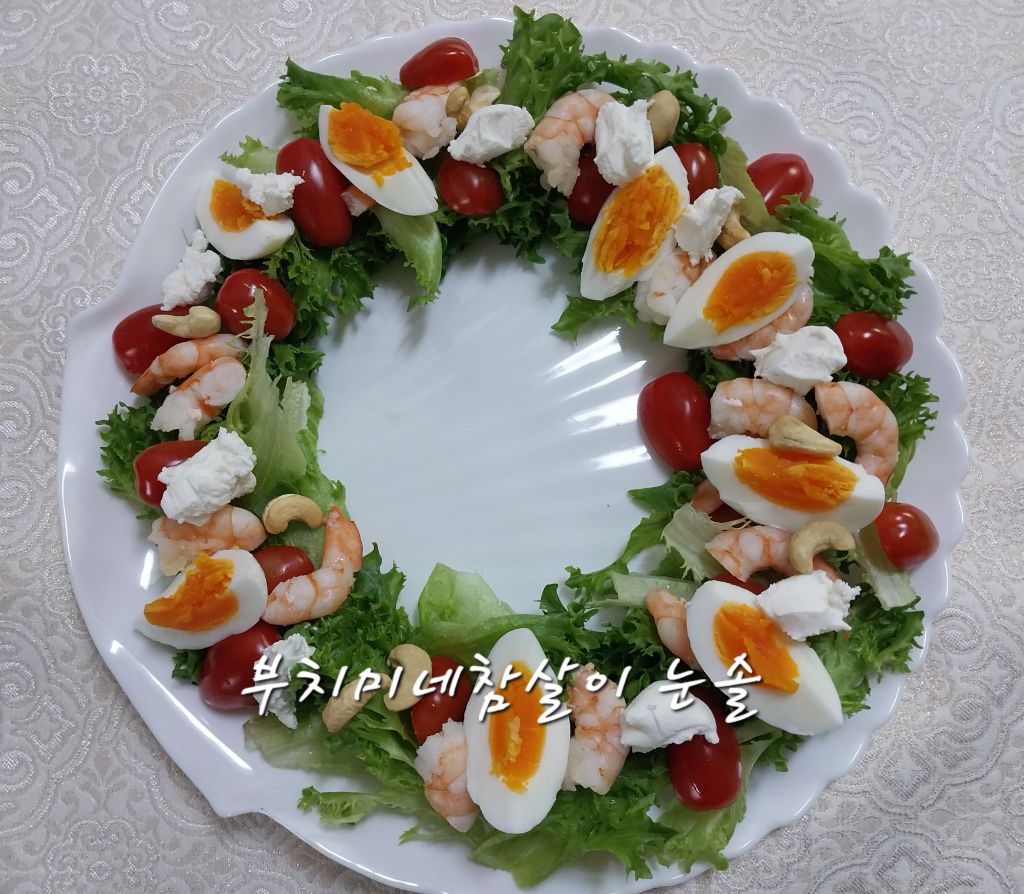 재료-프릴아이스,새싹채소,방울토마토10개,달걀2개,새우9마리,리코타치즈,캐슈넛,