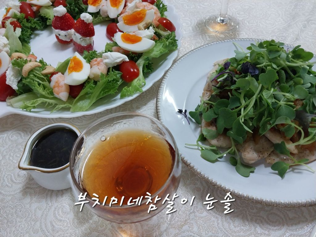 드레싱- 양조간장2큰술,유자청1큰술,발사믹식초2큰술,레몬즙1큰술,올리브유1큰술,후추