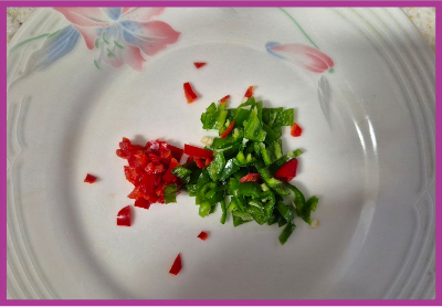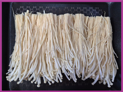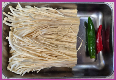 재료:팽이버섯 164g, 청양고추 1개, 홍고추 1/2개, 통깨 1/2T