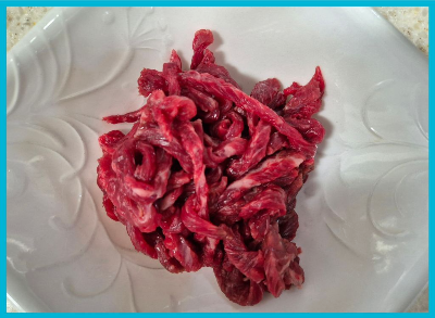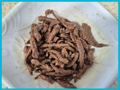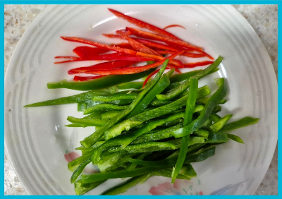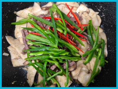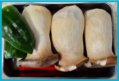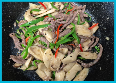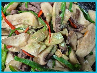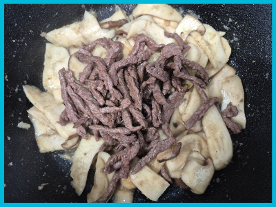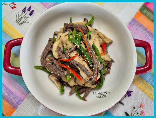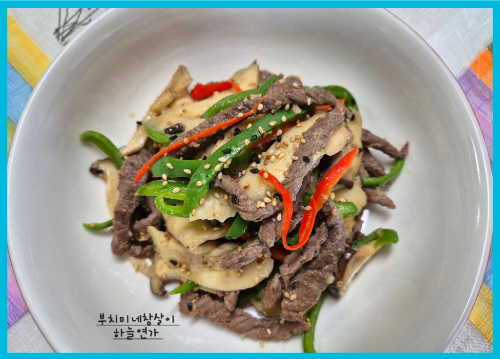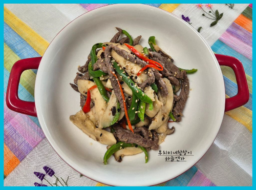 재료:새송이버섯 3개, 소고기 157g, 피망 2개, 홍고추 1개, 다진마늘 1/2T